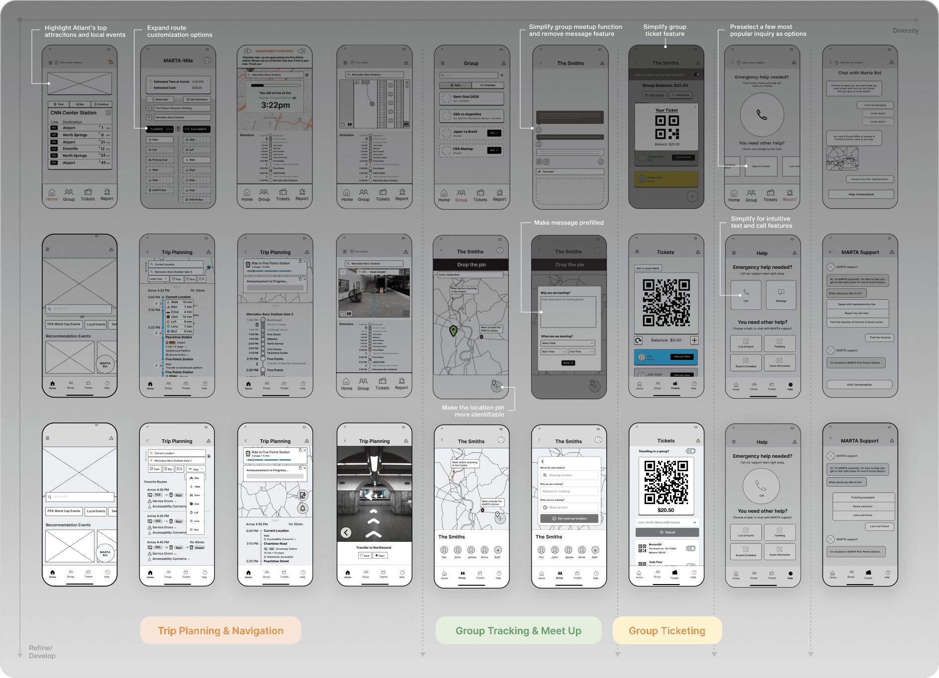 Our team used the Crazy 8s method to sketch and create digital versions of concepts. We then held two rounds of feedback sessions with MARTA employees to ensure the concepts aligned with future plans and business goals.